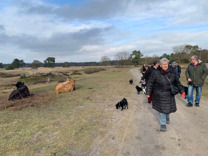 Het was heel gezellig, ontspannen, en zeker voor herhaling vatbaar. We hadden een gezelschap van ongeveer 20 personen. Ook nieuwe belangstellenden wandelden mee om kennis met het ras te maken. Twee hondjes van een ander ras liepen ook mee.